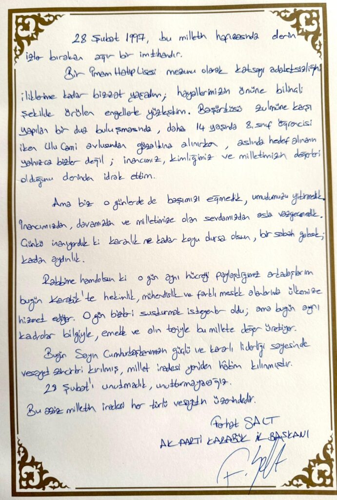 AK Parti Karabük İl Başkanı Ferhat Salt, Türk siyasi tarihine “postmodern darbe” olarak geçen 28 Şubat sürecinin 29’uncu yıl dönümü dolayısıyla yaşadıklarını kaleme aldı.